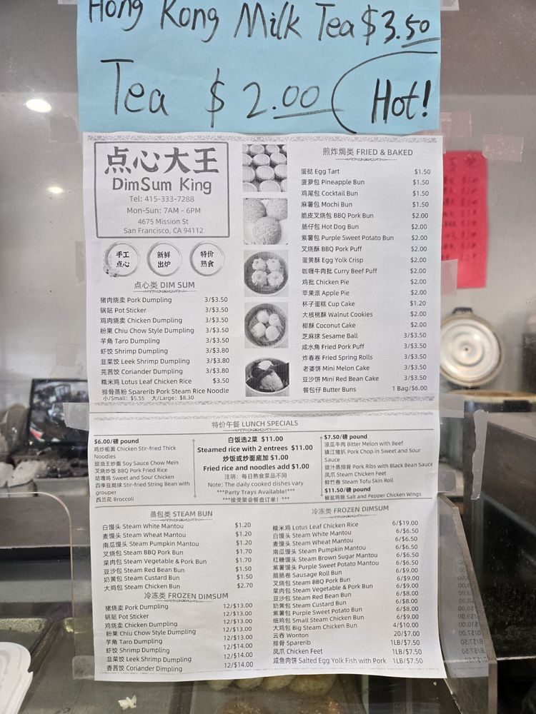 Welcome to Dim Sum King San Francisco, a delightful gem located on 4675 Mission St. This eatery specializes in authentic dim sum, offering a variety of dishes that burst with flavor. The menu features beloved staples such as har gow and pork siu mai, both expertly crafted with plump fillings and delicate wrappers. Highlighted by rave reviews, the shrimp rice roll and steamed spare ribs are must-tries, showcasing the restaurant's commitment to freshness and quality.